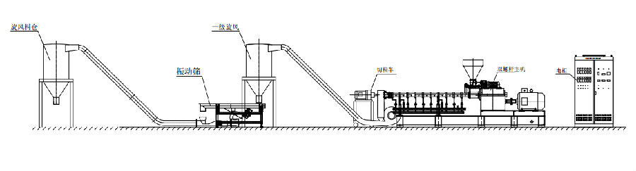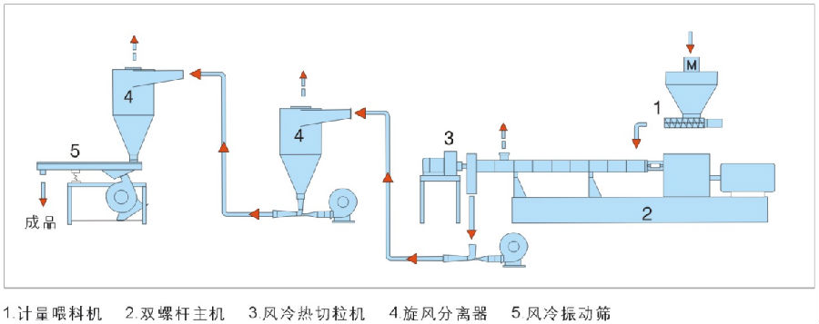 PP是世界上最常用的熱塑性塑料。隨著木粉的加入,主要用作合成地板復(fù)合材料來替代天然木地板。與天然木材相比,PP木材更環(huán)保耐用,更重要的是不招蟲,顯著延長了使用壽命。傳統(tǒng)方式是采用雙螺桿造粒機生產(chǎn)PP類木塑粒子。永杰對該配方有著豐富的經(jīng)驗,曾成功產(chǎn)出了65%木粒含量的PP木塑粒子。由于木材本身具有吸濕性,所以PP類木塑物料在冷卻切粒過程中不能與水接觸,因此建議采用以下方法進行PP類木塑纖維雙螺桿造粒生產(chǎn)線:風冷輸送帶拉條造粒和風冷模面熱切造粒。