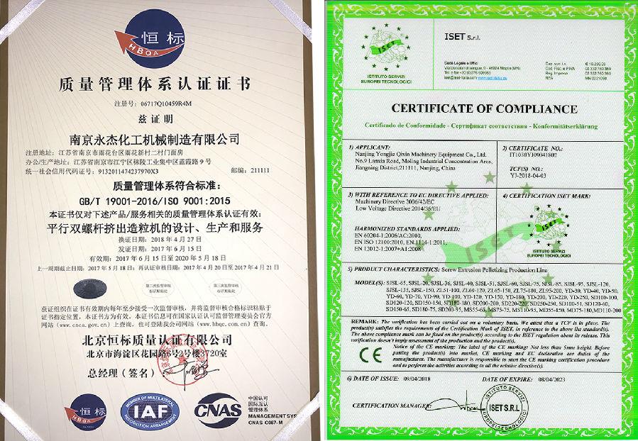 我司的所有造粒機(jī)組產(chǎn)品均通過(guò)了CE和ISO9001認(rèn)證,質(zhì)量有保障: